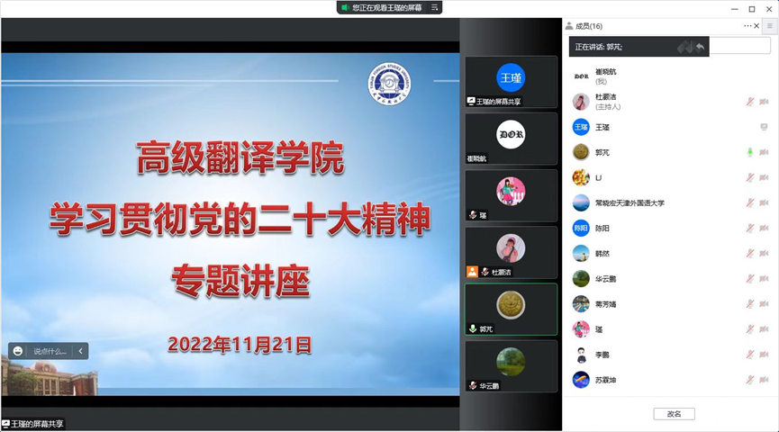 郭芃强调,中国式现代化,是中国共产党领导的社会主义现代化,既有各国现代化的共同特征,更有基于自己国情的中国特色。我们要深入领会理解中国式现代化的开创性意义,切实把党的二十大精神贯彻到学院教育教学全过程和各方面,坚持立德树人的根本任务,用习近平新时代中国特色社会主义思想铸魂育人,发挥翻译专业人才优势,积极宣传党的二十大精神,讲好中国故事,传播好中国声音。